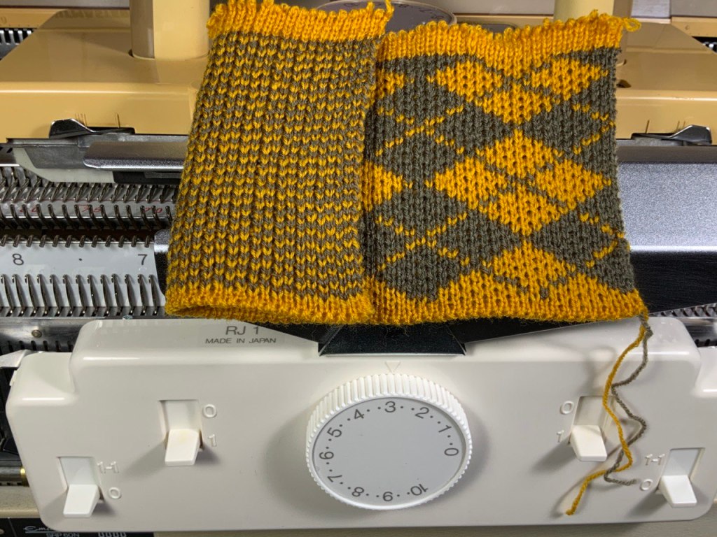 Tenía muchas ganas de probar este carro para la segunda cama de agujas Silver Reed / Knitmaster para hacer el conocido «Ojo de Perdiz» en el reverso del Jacquard Doble. El resultado es fantástico, me da la sensación que queda más consistente que cuando está tejido a base de rayas con el carro básico que acompaña al Ribber. También e importante, por lo menos en mi caso, los carros se deslizan más suavemente cuando se usa el RJ1. El trabajo del carro consiste en la formación de tejidos Jacquard mediante la selección automática y alternada de las agujas 1×1.