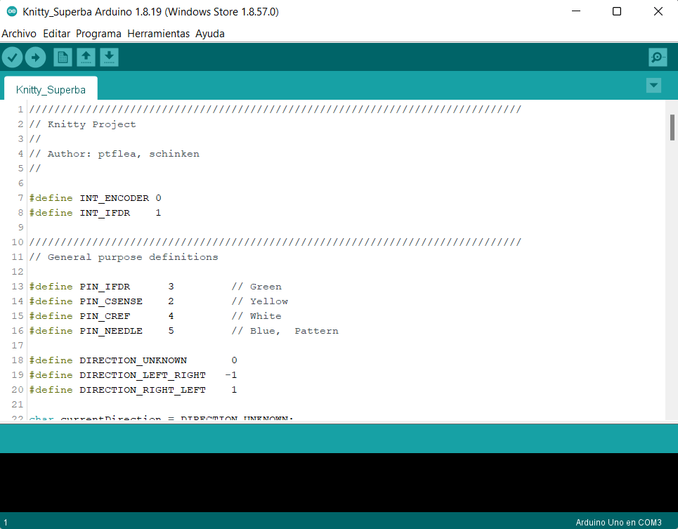 Comprueba si te funciona, a mí, me daba un error cuando usaba el botón en Knitty: «Connect Arduino». Para solucionar este problema, el miembro de Ravelry conocido como Zubynjoe, nos indico que una línea de código había que cambiar para que ya no produzca dicho error. Mil gracias de nuevo Joe por tu ayuda.