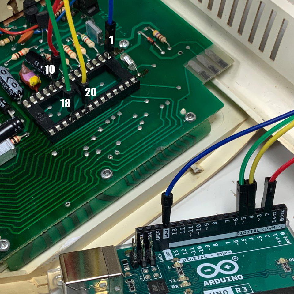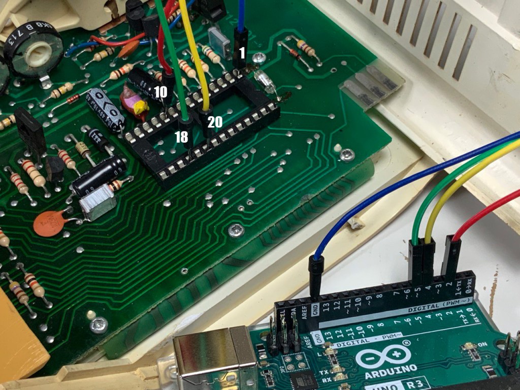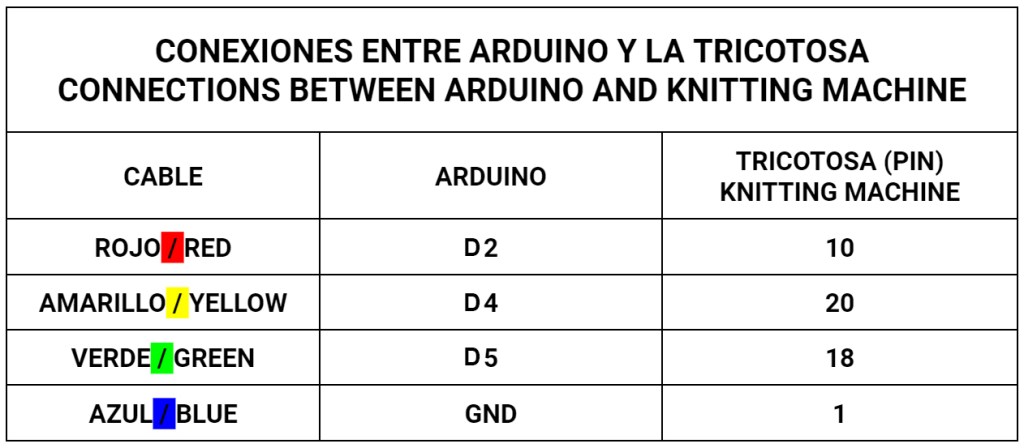 Join these connections with the jumper wires as shown in the picture, between the ARDUINO UNO and the knitting machine chip.