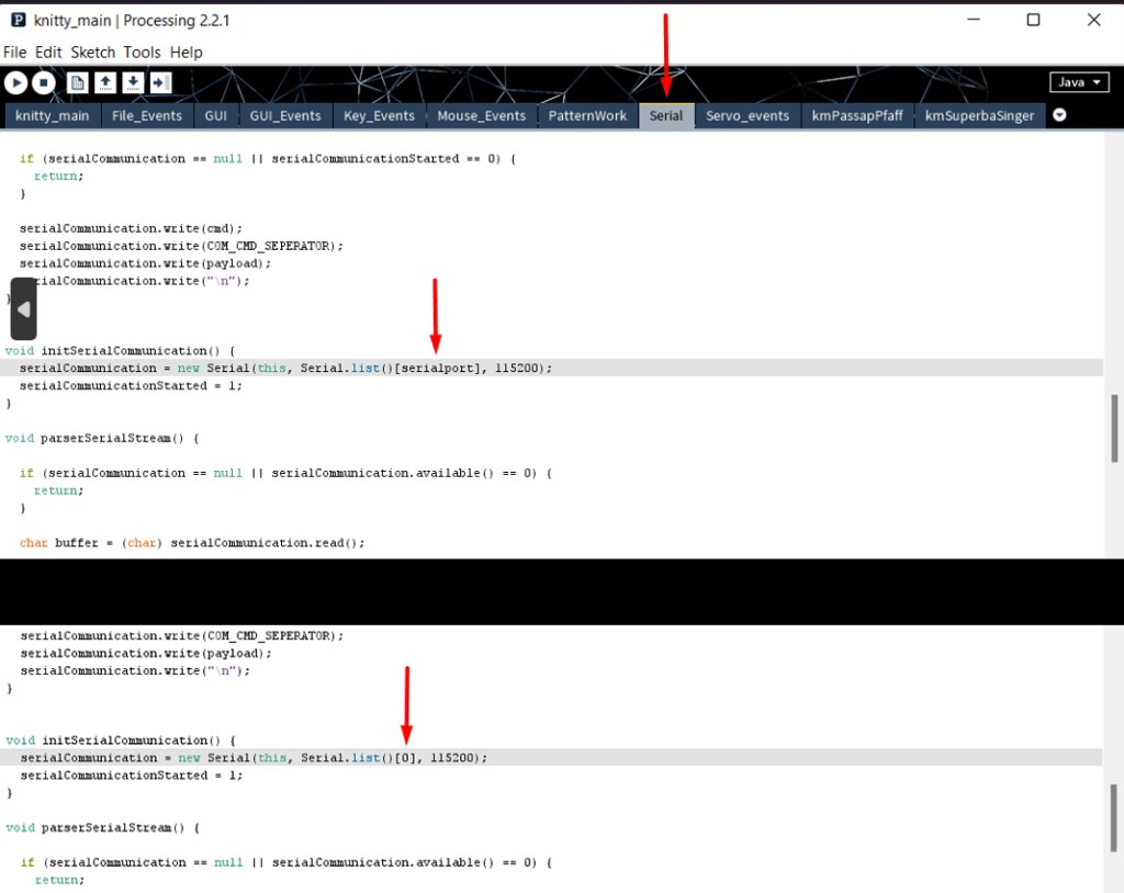 When you have Knitty open in Processing, look for a file called «Serial» in the tabs. Here you have to scroll to the line of code number 103 or search the line and where it says: [serialport], change it to a zero: [0].