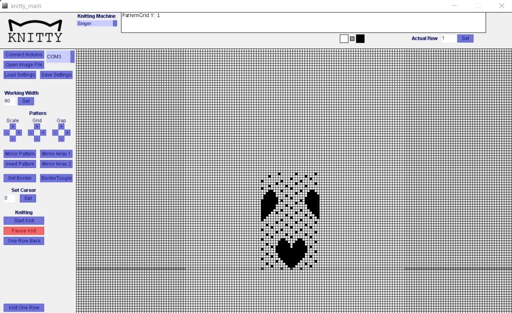 Pero aquí llegaba un nuevo desafío. Después que la máquina pasara por las manos de Joaquín para una puesta a punto y seguidamente tejer unos días con ella. Comprendí que era necesario hackearla y de este modo, eliminar la restricción en cuanto al tamaño de los diseños de los patrones de punto, que en esta tricotosa son 12 puntos por 16 vueltas y viceversa.