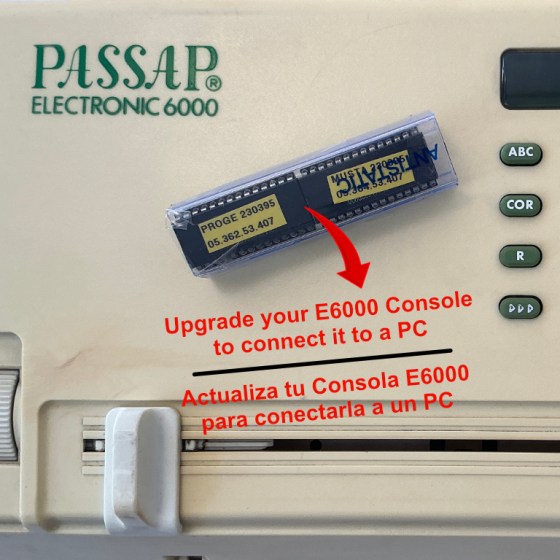 En la mayoría de los modelos de PASSAP E6000 es necesario actualizarla, es decir, cambiar dos chips que están en la consola por otros dos preparados para poder conectarla a un PC a través de DesignaKnit y/o Journal Six.